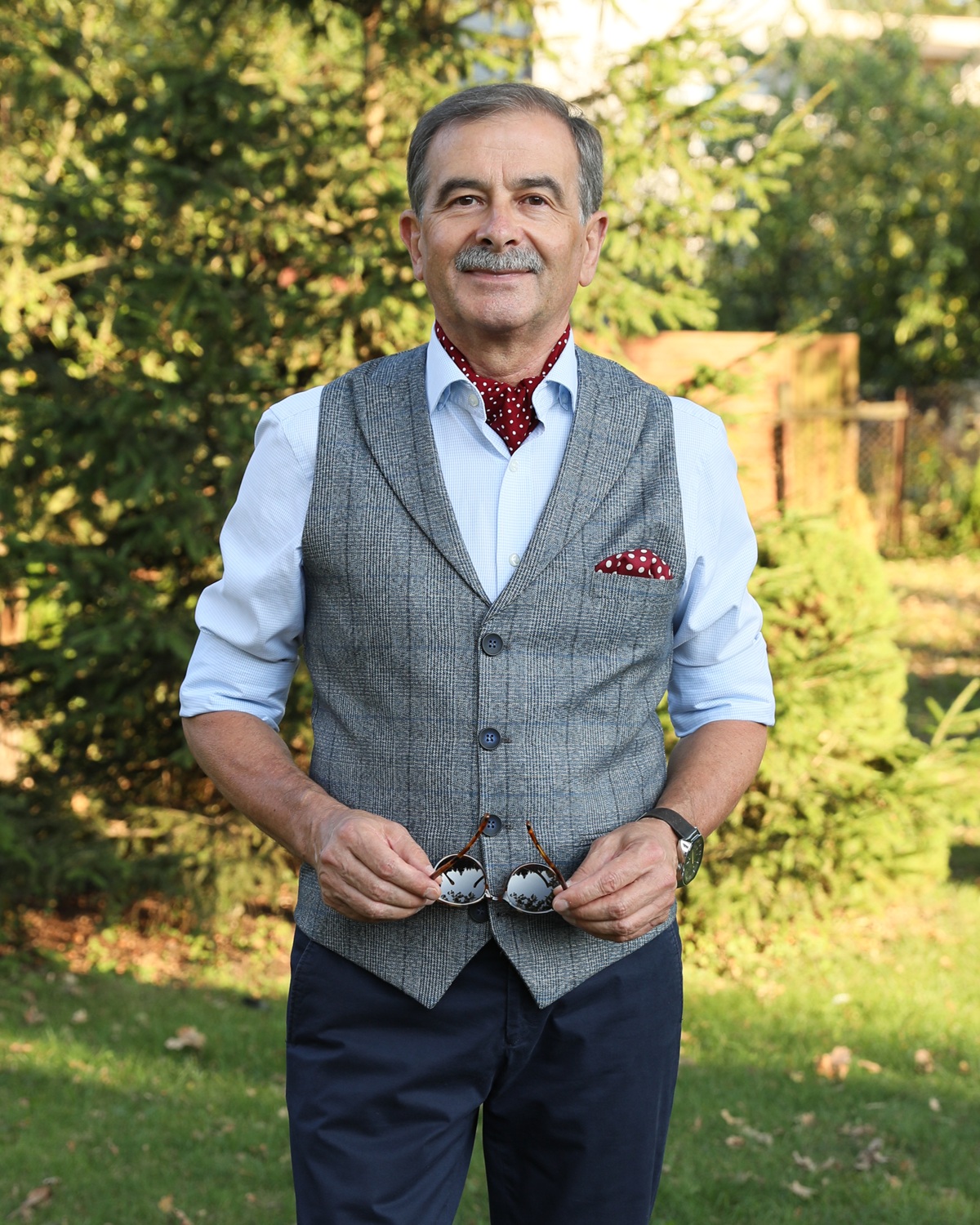 Ja noszę kamizelki rzadko i tylko jako część zestawu hybrydowego bądź smart każualowego z marynarką. Chętnie nosiłbym też garnitur trzyczęściowy, ale kupić takowy w rozsądnej cenie i w moim guście jest rzeczą niemal niewykonalną.