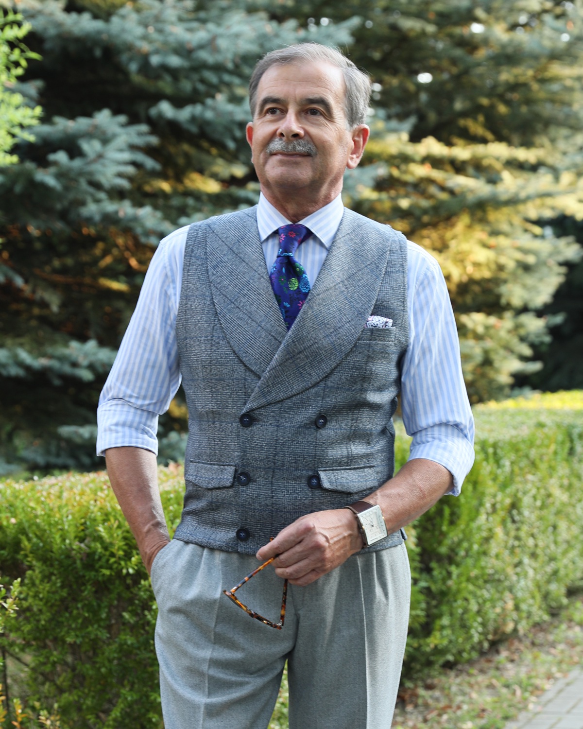 Inaczej sprawa się ma z kamizelką dwurzędową: w tym przypadku powinno się zapinać wszystkie guziki. Ale wiele osób przenosi bezrefleksyjnie zwyczaj niezapinania jednego guzika z kamizelki jednorzędowej na dwurzędową. Czy to można uznać za błąd? Raczej nie, ale można na tej podstawie wysnuć wniosek na temat modowego obycia osoby, która tak robi. W moim przypadku niezapięcie guzika kamizelki dwurzędowej należy uznać za wpadkę, która nie powinna się była zdarzyć. Nie usprawiedliwia mnie fakt, że zdjęcie pochodzi sprzed około 10 lat, chociaż niewątpliwie postrzeganie niektórych spraw zmieniło się przez ten czas.